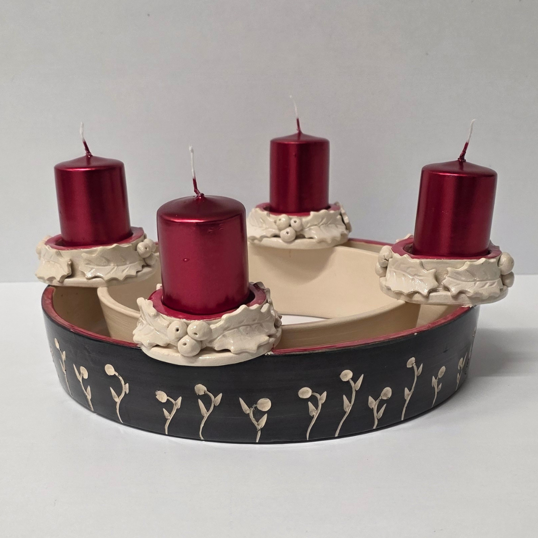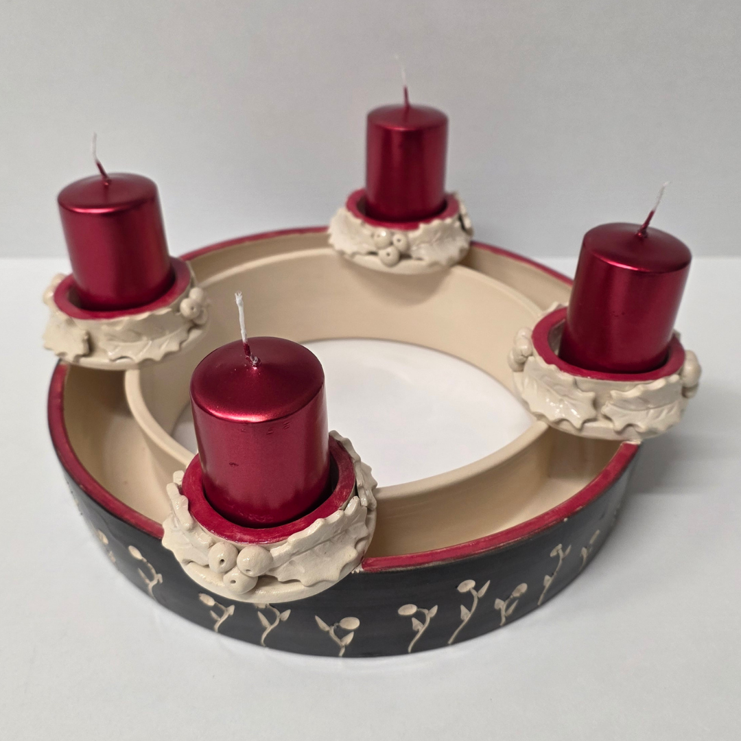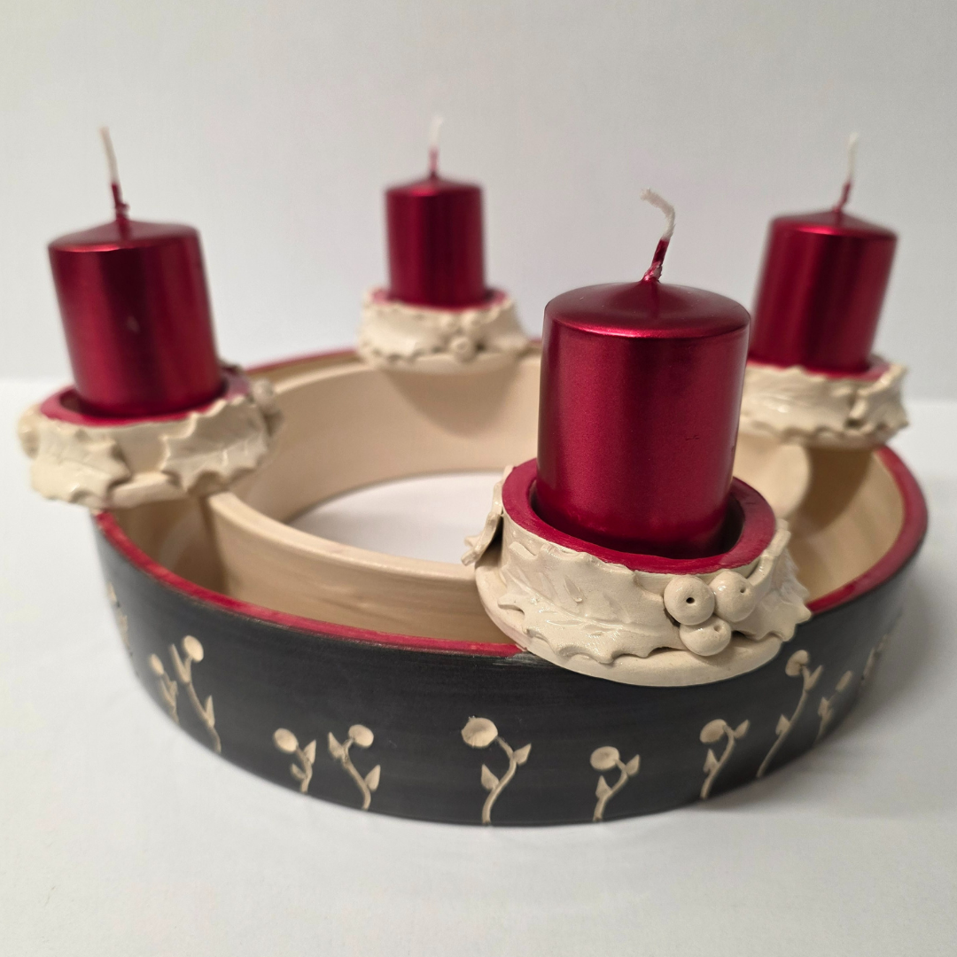 Ez a kézzel készült kerámia adventi koszorú a modern minimalizmust ötvözi a természetességgel: fekete külső, krém belső felület és kézzel formált bogyós–leveles gyertyafészkek adják karakterét.